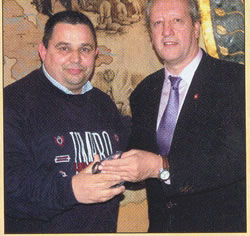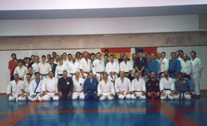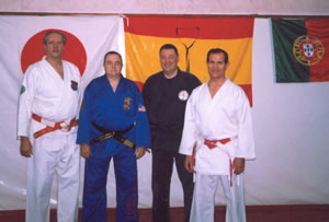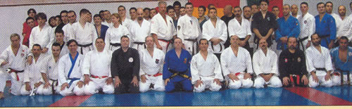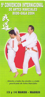 Convención Anual en Madrid. Se celebró la 9ª Convención Internacional de Artes Marciales Budo Gala 2004 en las instalaciones deportivas del Colegio Internacional Aristos de Getafe (Madrid) dirigida y organizada por el Maestro Pedro R. Dabauza. A la cita acudieron casi un centenar de amantes de las Artes Marciales como Judo, Karate, Taekwon-do, Hapkido, etc. Los encargados de impartir los distintos talleres fueron: Soshu Eric J. Gates, 8º Dan Shintai Jutsu, Shintai Iai Do, Shintai Ki Do; Soke Santiago Sanchis, 8º Dan de Ju Jutsu Do Combat, maestro internacional de seguridad; Sensei Ángel Gasco, 6º Dan de Jiu Jitsu, maestro de defensa personal. Así mismo asistieron destacados personajes como: Maestro Jose Luis de Isidro, 7º Dan de Aikido Kenkido; Maestro Antonio Enjuto, 7º Dan de Jiu Jutsu; Maestro José Cuspinero 7º Dan de Kaisenryu; Maestro Luis Fernando, 7º Dan de Jiu Jutsu (Portugal); Maestro Antonio Montes, 6º Dan de Taekwon-do; Maestro Jose Luis de Antonio Herrera, 5º Dan de Judo; Maestro Charles Jonson, 5º Dan de Jiu Jutsu (USA). Tras un respetuoso minuto de silencio en respeto por las víctimas del tremendo atentado del pasado día 11 de Marzo dio comienzo el acontecimiento según el horario previsto siendo todo un éxito. Publicado en la revista El Budoka. Los pasados 13 y 14 de Marzo se celebró en Madrid la 9ª Convención de Artes Marciales organizada y dirigida por el Maestro Pedro Rodriguez Dabauza. El sábado por la mañana, el Maestro Dabauza abrió el curso pidiendo un minuto de silencio en honor a las víctimas del ataque terrorista del 11-M. Los Maestros que impartían los cursos fueron el Coronel Santiago Sanchis, 8º Dan de Ju Jutsu Do Combat, El Gran Maestro Eric J. Gates, 8º Dan de Shintai Jutsu y el Maestro Ángel Gasco, 6º Dan de Jiu Jitsu. El Gran Maestro Santiago Sanchís impartió un curso de Ju Jutsu Do Combat, un estilo de competición fundado por él. Estuvo asistido por su equipo de cintos negros Víctor Martínez y Rubén Lerí, 4º y 2º Dan respectivamente, así como por los cintos negros de Jukaikido procedentes de Estados Unidos, Charles Jonson, Robert Sanchís y Jaeson Pieretti. A este curso asistieron cintos negros y Maestros reconocidos como los portugueses Luis Fernando y Victor Duarte ambos 7º Dan de Ju Jutsu, Antonio Enjuto, 7º Dan de Ju Jutsu, José Luis Isidro, 7º Dan de Aikido, José Cuspinera, 7º Dan de Kaysen-Ryu, Antonio Montes, 6º Dan de Taekwondo, Ángel Gasco, 6º Dan de Jiu Jitsu, Jose Luis de Antonio Herrera, 6º Dan de Judo... en un ambiente de hermandad y camaradería. Al curso de Jiu Jitsu del Maestro Gasco asistieron todos los Maestros y cintos negros, disfrutando de sus técnicas y de una espectacular exhibición a cargo de sus hijos. El curso de Iaido impartido por el GM Eric Gates cerró la jornada y se destacó por la perfección de las técnicas desarrolladas. Además el Maestro Gates nos enseñó a sacar la katana y realizar los cortes correctamente, corrigiendo elegantemente nuestros errores. Tras una conferencia sobre Artes Marciales asistimos a una cena que contaba entre sus invitados especiales con el Director de esta revista, el Maestro Tucci y el Teniente Coronel de la Gendarmería francesa Raymond Carter. El Maestro Dabauza hizo la entrega de trofeos a los tres Maestros que impartieron los cursos: Sanchís, Gates y Gasco, así como a los Maestros destacados en ésta y otras convenciones. En las fotos podemos apreciar el momento de la entrega al representante de Portugal, Luis Fernando y al grupo de participantes.