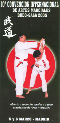 Artículos sobre la Budo Gala 2005: Un año más esta vez en nuestra décima edición, nos reunimos en unas jornadas de Budo. En esta edición, como en años anteriores, los maestros estaban preparados, pudimos apreciar la técnica y pedagogía del maestro Franz Knafl (Austria) 8ºDan Ju Jutsu, Soshu Eric J. Gates (Inglaterra) 8ºDan Shintai-Iai-Ki Jutsu y el Guanhaben Indalecio Socorro (España) Tolete Canario. Asimismo, asistieron grandes Maestros de Budo como Antonio Enjuto Kyoshi 7ºDan Ju Jutsu, Jose L. Isidro 7ºDan Aiki Do, Luis Fernando Kyoshi 7ºDan Ju Jutsu, Angel Gasco, 6ºDan Ju Jutsu, Antonio Montes 6ºDan Tae Kwon Do, Dario Díaz 4ºDan Kenpo, etc. En la sesión de mañana, en la cual los alumnos rotaron por las tres áreas, el Maestro F. Knafl desarrolló su escuela Kawashi Ryu,Ryu desarrollada en Europa por el Sensei Kawashi y que tiene una presencia muy importante en Austria con su máximo exponente el Sensei Wenstetten 10ºDan Ju Jutsu. El Soshu E. Gates desarrolló Kyushu aplicado, Ki en técnicas desarmadas, Shintai Iai Jutsu-Iai Do, Ken Jutsu y trabajo en Nito Waza. El Guanhaben I. Socorro desarrolló técnica tradicional y aplicación policial del tolete canario. Tras las sesiones prácticas y la pausa de la comida se realizó un coloquio con los Maestros de la Convención en la cual se trató de temas relacionados con el Budo, dentro de este acto el Maestro Isidro presentó su ultimo libro reflexiones de un guerrero y el Sensei David Moronta nos presentó su trabajo sobre fundamentos de Judo aplicados en forma de Kata. Despues de