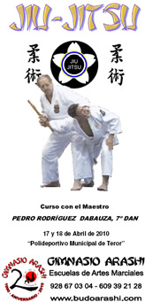 - 20 ANIVERSARIO GIMNASIO ARASHI Dentro de los actos de celebración del 20 Aniversario del Gimnasio Arashi en Las Palmas de Gran Canaria y organizado por su director el Maestro Miguel Ángel Pérez, tuvo lugar en el Polideportivo de Teror el Seminario de Ju Jutsu impartido por el Maestro Pedro R. Dabauza 7º Dan de Ju Jutsu RFEJyDA y 7º Dan de Judo. A lo largo del Seminario se desarrollaron Encadenamientos diversos Controles, Ju Waza, Trabajo sobre Te gatame / Kote Hineri y Trabajo sobre Shiho Nage. El Seminario se desarrolló con gran interés y esfuerzo por parte de los participantes, al mismo acudió para compartir unos momentos el Maestro Manuel Rodríguez, pionero del Ju Jutsu en Canarias. Gracias a todos por la hospitalidad recibida en esas tierras de Canarias.