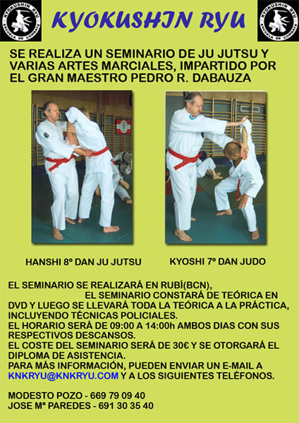 Se celebró el Seminario previsto de ju jutsu en las magnificas instalaciones del gimnasio Fitness & Wellness, organizado con todo su entusiasmo por la asociación Kyokushin Ryu. El Seminario fue impartido por el Hanshi Pedro R. Dabauza 8ºDan Ju Jutsu y Kyoshi 7ºDan Judo. Al mismo asistieron maestros como Modesto Pozo, José Mª Paredes y Hinojosa. El seminario comenzó con la proyección del dvd "El camino del guerrero" Una visión de la historia de las Budo en oriente hasta su llegada a Japón. A lo largo del mismo se vieron conceptos como Ki Hon de Ju Jutsu (fundamentos), diversos Renraku Waza (encadenamientos de controles) y trabajo sobre las Waza (técnicas) Te Gatame / Kote Hineri. Fue una satisfacción ver a los alumnos entrenar con perseverancia en el seminario. Publicado en la revista "El Budoka" en Noviembre de 2008
