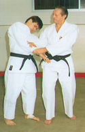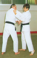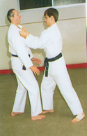 El atacante nos agarra de las solapas y a la vez inicia un golpe con su cabeza a nuestra cara | Parada del golpe a nuestro rostro y Atemi Teisho a los testículos | Atemi Ago Tsuki por el interior de sus brazos | Enroscamos uno de sus brazos | Con el mismo brazo que enroscamos, le sujetamos el otro para llevarle controlado |