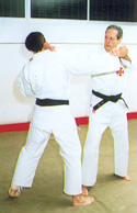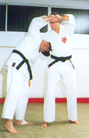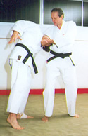 Tai Sabaki y Atemi de Tettsui al biceps para defenderse | Daremos Atemi de Shuto al atacante | Seguidamente enroscaremos el cuello | La cabeza del atacante quedará en nuestra axila para controlarle totalmente |