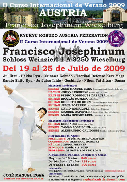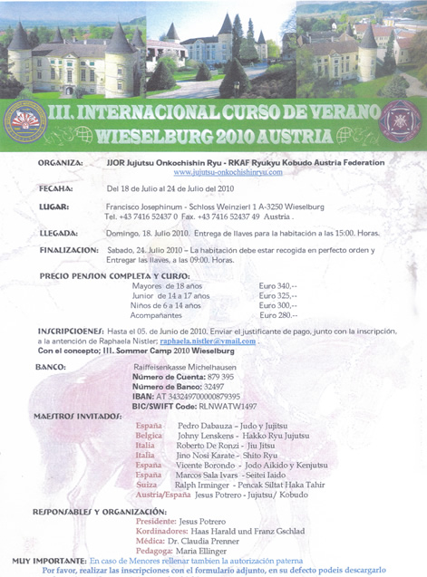 Las jornadas se sucedieron con sesiones de mañana y tarde para que los participantes pudieran adentrarse en las enseñanzas de los distintos maestros y en los Budo diferentes. Seminario Budo Camp 2009 - Wieselburg (Austria) Nuevamente nos dimos cita en los valles austriacos, en Wieselburg para vivir un Budo - Camp organizado por Ryukyu Kobudo Austria Federation. Este año los maestros fueron: