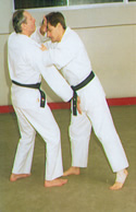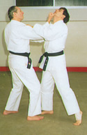 El atacante nos agarra de las solapas y a la vez inicia un golpe con su cabeza a nuestra cara | Parada del golpe a nuestro rostro y Atemi Teisho a los testículos | Atemi Ago Tsuki por el interior de sus brazos | Enroscamos uno de sus brazos | Con el mismo brazo que enroscamos, le sujetamos el otro para llevarle controlado |