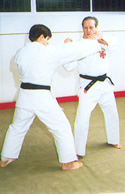 Tai Sabaki y Atemi de Tettsui al biceps para defenderse | Daremos Atemi de Shuto al atacante | Seguidamente enroscaremos el cuello | La cabeza del atacante quedará en nuestra axila para controlarle totalmente |